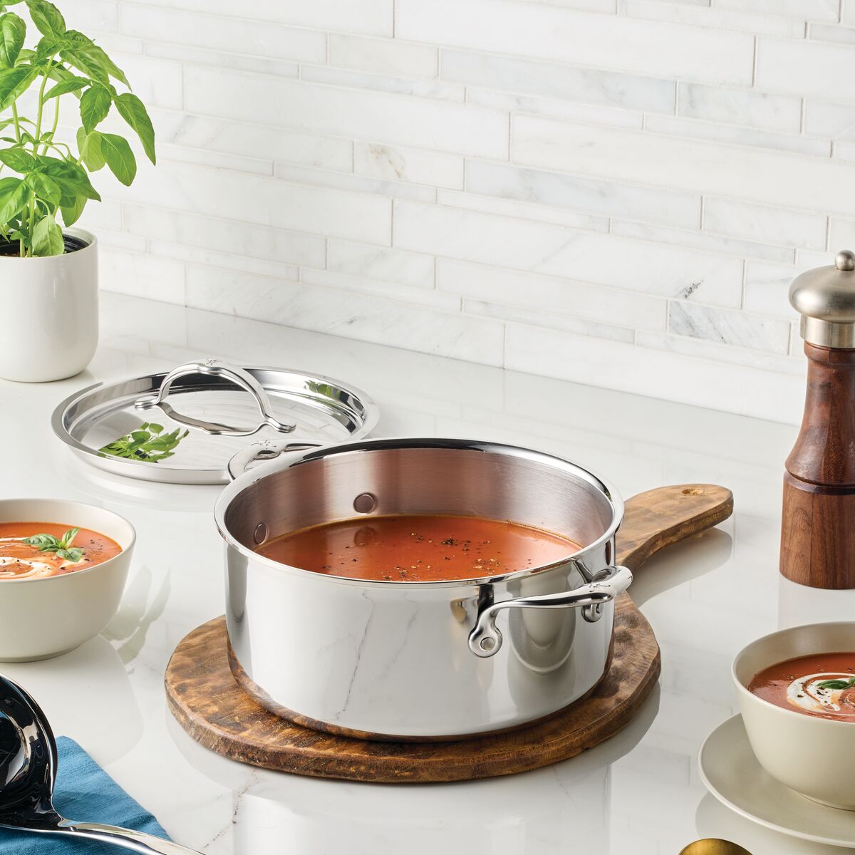 Purposeful innovation, functionality, and Italian craftsmanship converge with the ProBond® Luxe 4-Quart Polished Professional Clad Stainless Steel Soup Pot with Lid. Ideal for soups, grains, sauce reductions, and sides, this ProBond® Luxe vessel brings precision performance to your home kitchen.